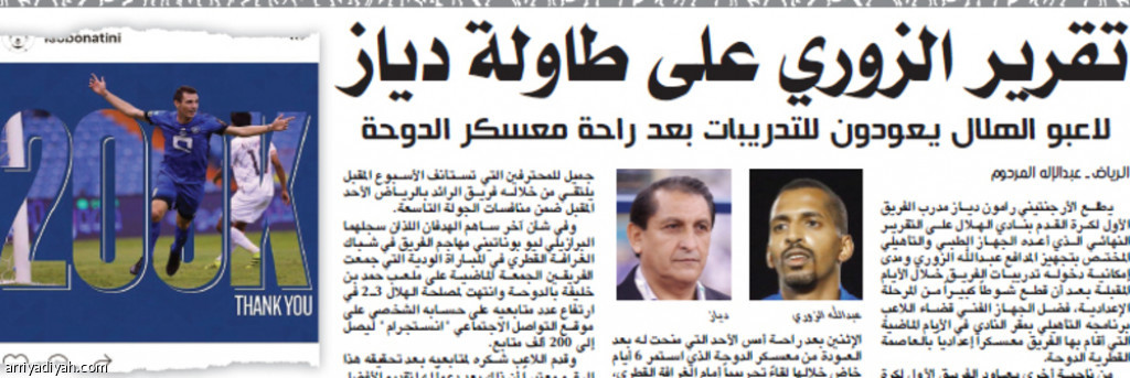 يطلع الأرجنتيني رامون دياز مدرب الفريق الأول لكرة القدم بنادي الهلال على التقرير النهائي الذي أعده الجهاز الطبي والتأهيلي المختص بتجهيز المدافع عبدالله الزوري ومدى إمكانية دخوله تدريبات الفريق خلال الأيام المقبلة بعد أن قطع شوطاً كبيراً من المرحلة الإعدادية، فضل الجهاز الفني قضاء اللاعب برنامجه التأهيلي بمقر النادي في الأيام الماضية التي أقام بها الفريق معسكراً إعدادياً بالعاصمة القطرية الدوحة.