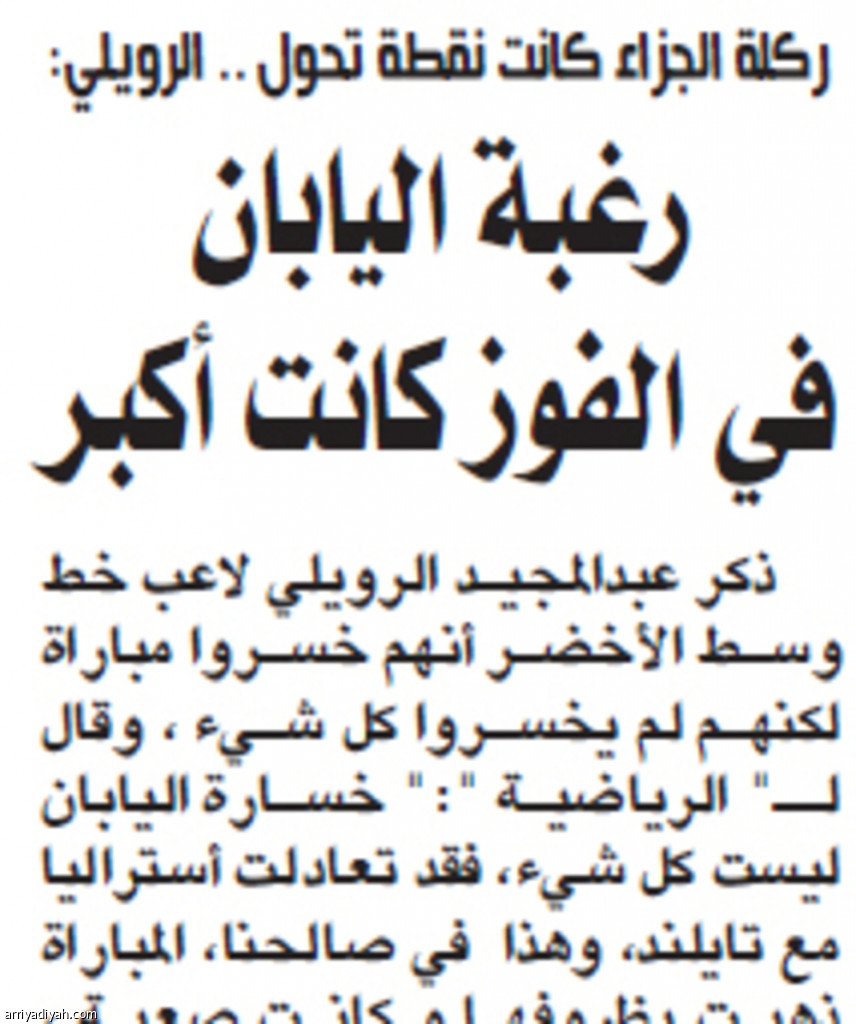 ذكر عبدالمجيد الرويلي لاعب خط وسط الأخضر أنهم خسروا مباراة لكنهم لم يخسروا كل شيء ، وقال لـ" الرياضية ":" خسارة اليابان ليست كل شيء، فقد تعادلت أستراليا مع تايلند، وهذا في صالحنا، المباراة ذهبت بظروفها و كانت صعبة ، والخصم لعب على أرضه وبين جماهيره وكانت لديهم رغبة أكبر، كنا نحاول المحافظة على الفارق النقطي لكن لم تكن مكتوبة لنا"، وعن ركلة الجزاء قال : أثرت علينا وكانت نقطة تحول في المباراة.