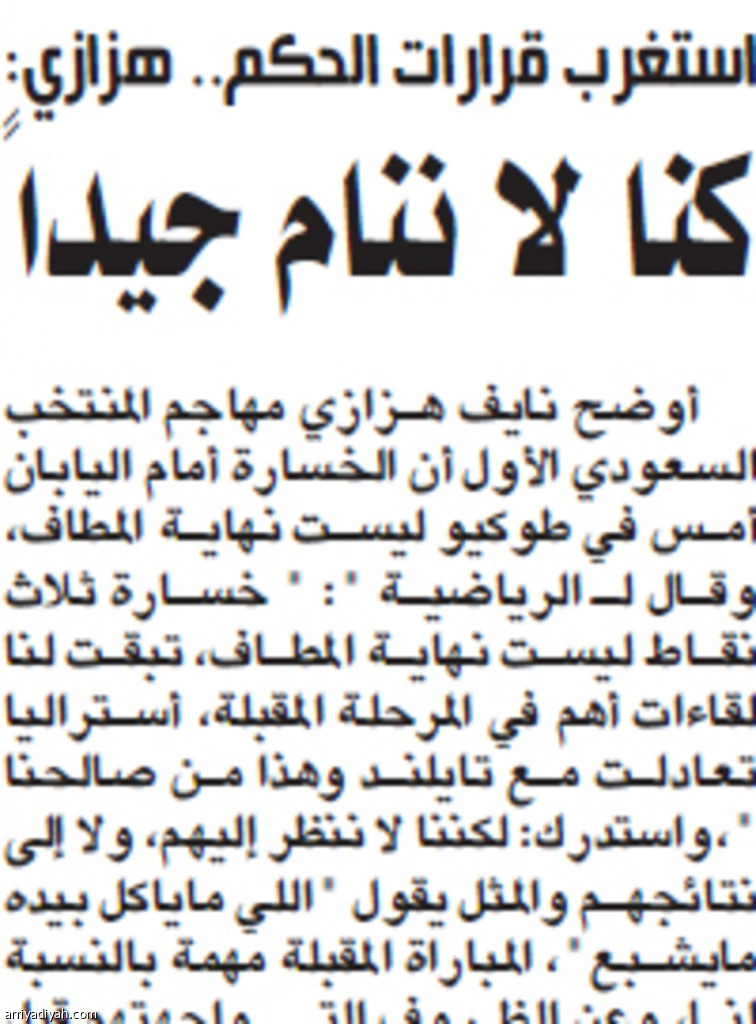 أوضح نايف هزازي مهاجم المنتخب السعودي الأول أن الخسارة أمام اليابان أمس في طوكيو ليست نهاية المطاف، وقال لـ الرياضية ": " خسارة ثلاث نقاط ليست نهاية المطاف، تبقت لنا لقاءات أهم في المرحلة المقبلة، أستراليا تعادلت مع تايلند وهذا من صالحنا "،واستدرك: لكننا لا ننظر إليهم، ولا إلى نتائجهم والمثل يقول "اللي ماياكل بيده مايشبع"، المباراة المقبلة مهمة بالنسبة لنا، وعن الظروف التي واجهتهم قبل وخلال المباراة ، زاد:" الأجواء أثرت علينا إضافة إلى التوقيت، كنا لا ننام جيداً رغم وصولنا إلى طوكيو مبكرا، ليس هذا اعتذار لكننا لم نكن موفقين في المباراة"، وعن ركلة الجزاء قال : غير صحيحة، لقد أثرت علينا إضافة إلى أن الكروت الصفراء التي حصل عليها معاذ والخيبري بداية المباراة أثرت على مستوياتهم.