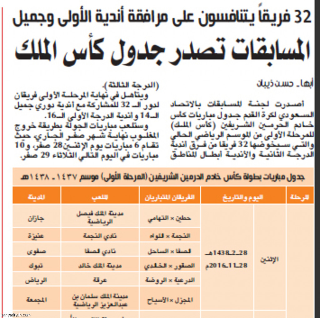 أصدرت لجنة المسابقات بالاتحاد السعودي لكرة القدم جدول مباريات كأس خادم الحرمين الشريفين (كأس الملك) للمرحلة الأولى من الموسم الرياضي الحالي والتي سيخوضها 32 فريقا من فرق أندية الدرجة الثانية والأندية أبطال المناطق (الدرجة الثالثة).