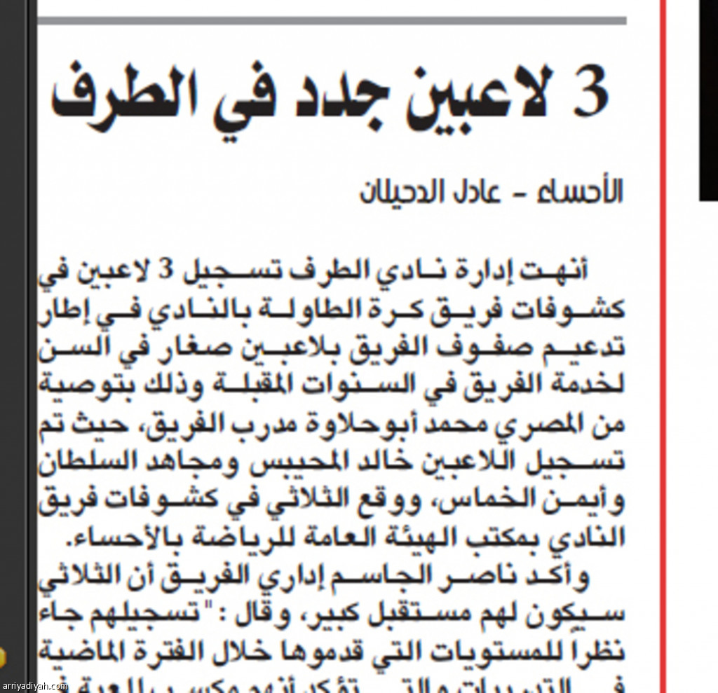 أنهت إدارة نادي الطرف تسجيل 3 لاعبين في كشوفات فريق كرة الطاولة بالنادي في إطار تدعيم صفوف الفريق بلاعبين صغار في السن لخدمة الفريق في السنوات المقبلة وذلك بتوصية من المصري محمد أبوحلاوة مدرب الفريق، حيث تم تسجيل اللاعبين خالد المحيبس ومجاهد السلطان وأيمن الخماس، ووقع الثلاثي في كشوفات فريق النادي بمكتب الهيئة العامة للرياضة بالأحساء.