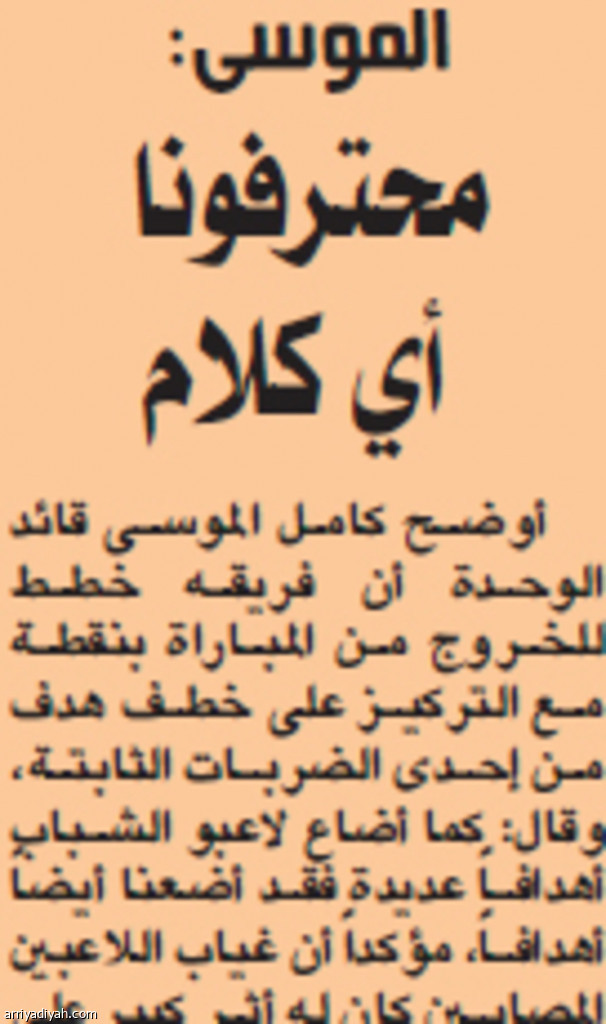 أوضح كامل الموسى قائد الوحدة أن فريقه خطط للخروج من المباراة بنقطة مع التركيز على خطف هدف من إحدى الضربات الثابتة، وقال: كما أضاع لاعبو الشباب أهدافاً عديدة فقد أضعنا أيضاً أهدافاً، مؤكداً أن غياب اللاعبين المصابين كان له أثر كبير على أداء الفريق، وكان حرص المدافعين ألا يدخل مرمانا أي أهداف بعد أن نال دفاع الوحدة لقب الأسوأ بين أندية الدوري، مشيراً إلى أن كل الفرق استفادت من لاعبيها المحترفين إلا محترفي الوحدة لم يضيفوا أي جديد للفرسان.