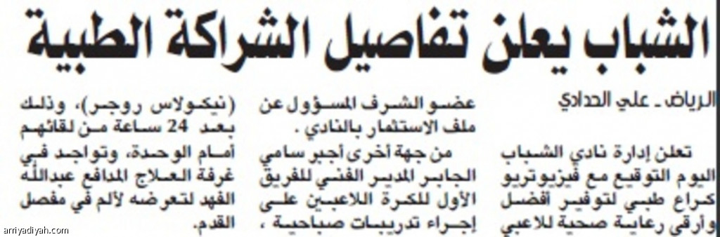 تعلن إدارة نادي الشباب اليوم التوقيع مع فيزيوتريو كراع طبي لتوفير أفضل وأرقى رعاية صحية للاعبي الفريق وذلك خلال مؤتمر صحفي بحضــور الأمير عبدالله بن خالد بن سلطان عضو الشرف المسؤول عن ملف الاستثمار بالنادي .