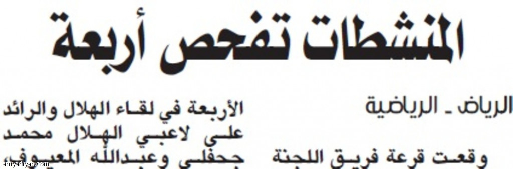 وقعت قرعة فريق اللجنة السعودية للرقابة على المنشطات لأخذ عينات اللاعبين الأربعة في لقاء الهلال والرائد على لاعبي الهلال محمد جحفلي وعبدالله المعيوف، ومن الرائد إسماعيل بانجورا ومحمد العمري.