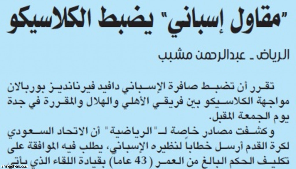 وكشفت مصادر خاصة لـ"الرياضية" أن الاتحاد السعودي لكرة القدم أرسل خطاباً لنظيره الإسباني، يطلب فيه الموافقة على تكليف الحكم البالغ من العمر (43 عاماً) بقيادة اللقاء الذي يأتي ضمن الجولة 10 لبطولة دوري جميل للمحترفين.