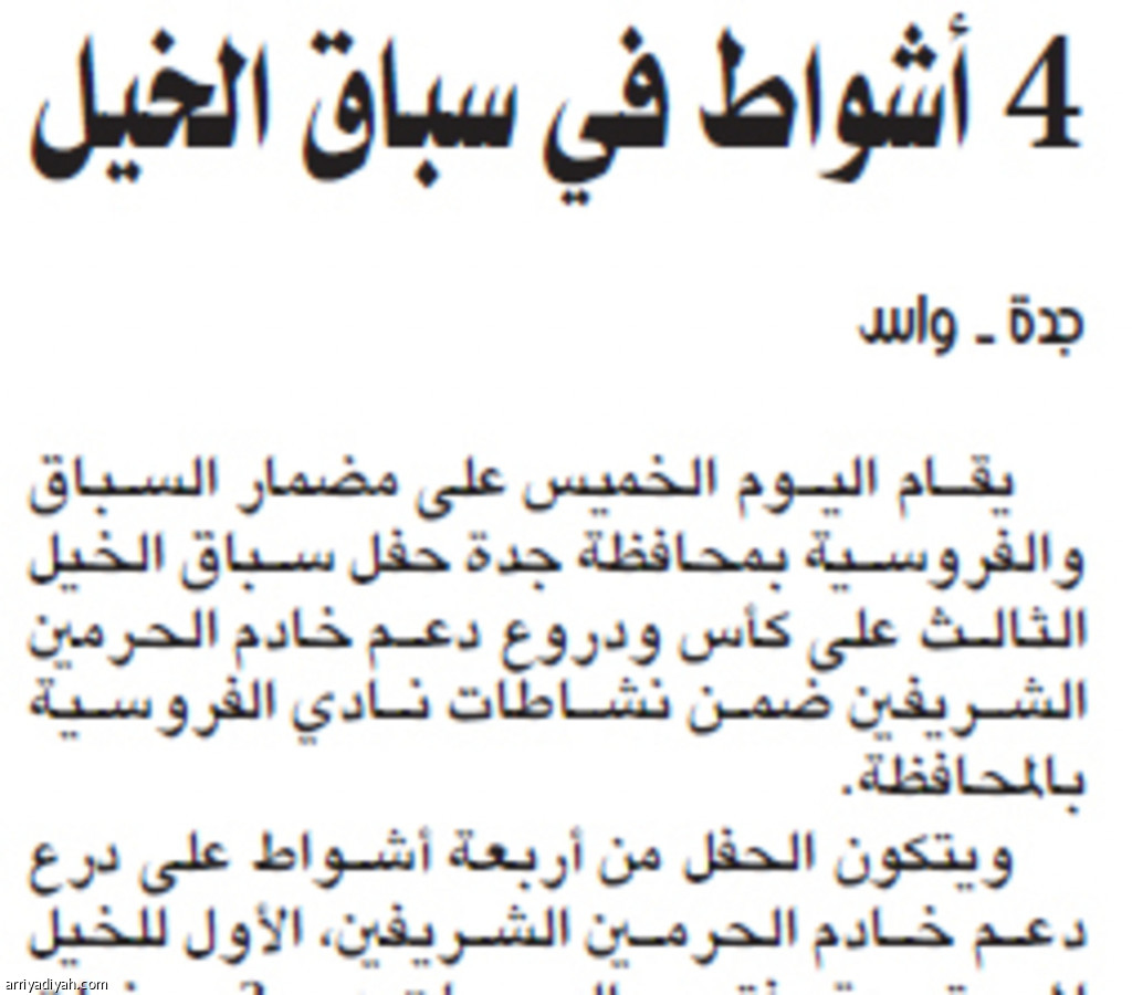 يقام اليوم الخميس على مضمار السباق والفروسية بمحافظة جدة حفل سباق الخيل الثالث على كأس ودروع دعم خادم الحرمين الشريفين ضمن نشاطات نادي الفروسية بالمحافظة.