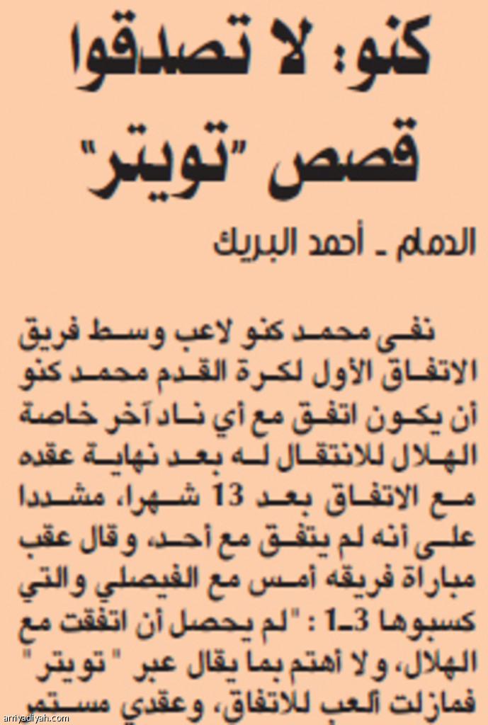 نفى محمد كنو لاعب وسط فريق الاتفاق الأول لكرة القدم محمد كنو أن يكون اتفق مع أي ناد آخر خاصة الهلال للانتقال له بعد نهاية عقده مع الاتفاق بعد ١٣ شهرا، مشددا على أنه لم يتفق مع أحد، وقال عقب مباراة فريقه أمس مع الفيصلي والتي كسبوها ٣ـ١ :"لم يحصل أن اتفقت مع الهلال، ولا أهتم بما يقال عبر "تويتر" فمازلت ألعب للاتفاق، وعقدي مستمر معهم"، وأضاف :"سأرد على عرض الإدارة قبل نهاية عقدي، الذي تبقى منه سنة وشهر"، وتابع متحدثا عن المباراة :"تأخرنا بهدف، ولكن نجحنا في العودة وتسجيل ثلاثة أهداف، ولم نتأثر بهدف الفيصلي على الرغم من أننا أهدرنا فرصا كثيرة في الشوط الأول"، أضاف :"تعاهدنا كلاعبين على ألا نتوقف، وأن نستمر بنفس الأداء ختى تحقيق الفوز، وهذا ما تحقق".