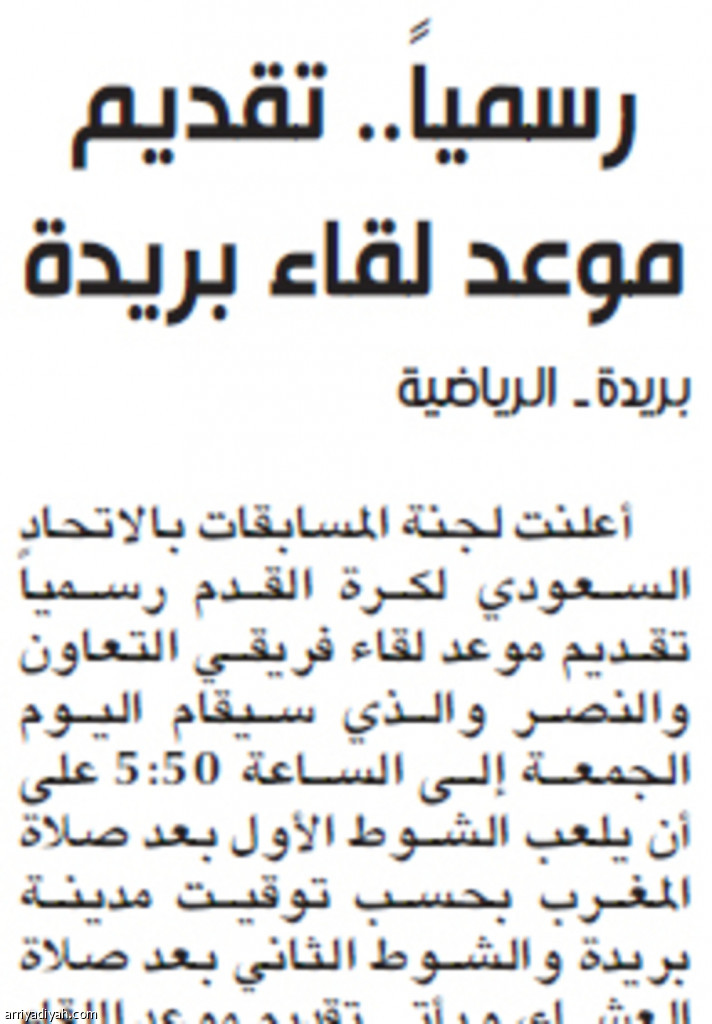 أعلنت لجنة المسابقات بالاتحاد السعودي لكرة القدم رسمياً تقديم موعد لقاء فريقي التعاون والنصر والذي سيقام اليوم الجمعة إلى الساعة 5:50 على أن يلعب الشوط الأول بعد صلاة المغرب بحسب توقيت مدينة بريدة والشوط الثاني بعد صلاة العشاء، ويأتي تقديم موعد اللقاء بعد موافقة الناديين على ذلك، وتحسبا لهطول أمطار غزيرة قد تؤثر على سير المباراة بحسب قراءات الهيئة العامة للأرصاد وحماية البيئة.