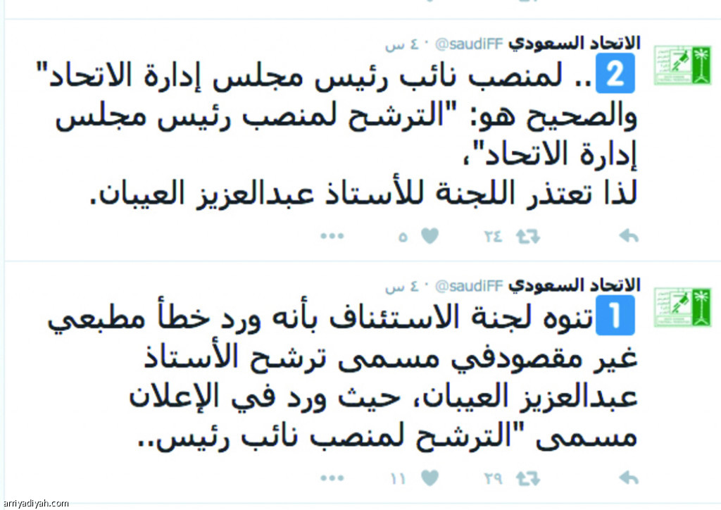 أخطأت لجنة الانتخابات في بيانها الصادر أمس الخميس فيما يخص المرشح عبدالعزيز العيبان حيث سمته اللجنة في بيانها المرشح لمنصب نائب رئيس مجلس ادارة الاتحاد، وذلك في البيان الذي صدر عند الـ 7:55 مساء قبل أن تعود بتغريدتين تعتذر فيهما للمرشح العيبان عبر حساب الاتحاد السعودي لكرة القدم وقالت في اعتذارها " تنوه لجنة الاستئناف بأنه ورد خطأ مطبعي غير مقصود في مسمى ترشح عبدالعزيز العيبان، حيث ورد في الإعلان مسمى "الترشح لمنصب نائب رئيس مجلس إدارة الاتحاد" والصحيح هو: "الترشح لمنصب رئيس مجلس إدارة الاتحاد"، لذا تعتذر اللجنة.