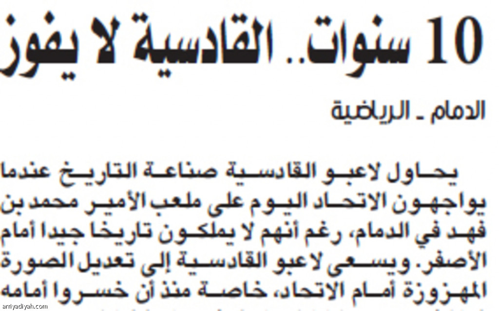 يحاول لاعبو القادسية صناعة التاريخ عندما يواجهون الاتحاد اليوم على ملعب الأمير محمد بن فهد في الدمام، رغم أنهم لا يملكون تاريخا جيدا أمام الأصفر. ويسعى لاعبو القادسية إلى تعديل الصورة المهزوزة أمام الاتحاد، خاصة منذ أن خسروا أمامه ١ـ٧ في موسم ٢٠٠٩ و٠ـ٨ في عام ٢٠١١.