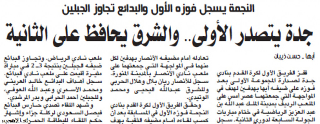 سجل هدف المباراة الوحيد فرحان الفرحان. وتعادل الرياض مع ضيفه سدوس سلبياً في اللقاء الذي أقيم على ملعب نادي الرياض. وتجاوز البدائع ضيفه الجبلين بنتيجة 3ـ 2 في مباراة مثيرة أقيمت على ملعب نادي البدائع. سجل أهداف البدائع خالد العريني ومحمد الأسمري وعبد الله العوفي، وللجبلين أحمد الحرابي وبدر المرشدي.