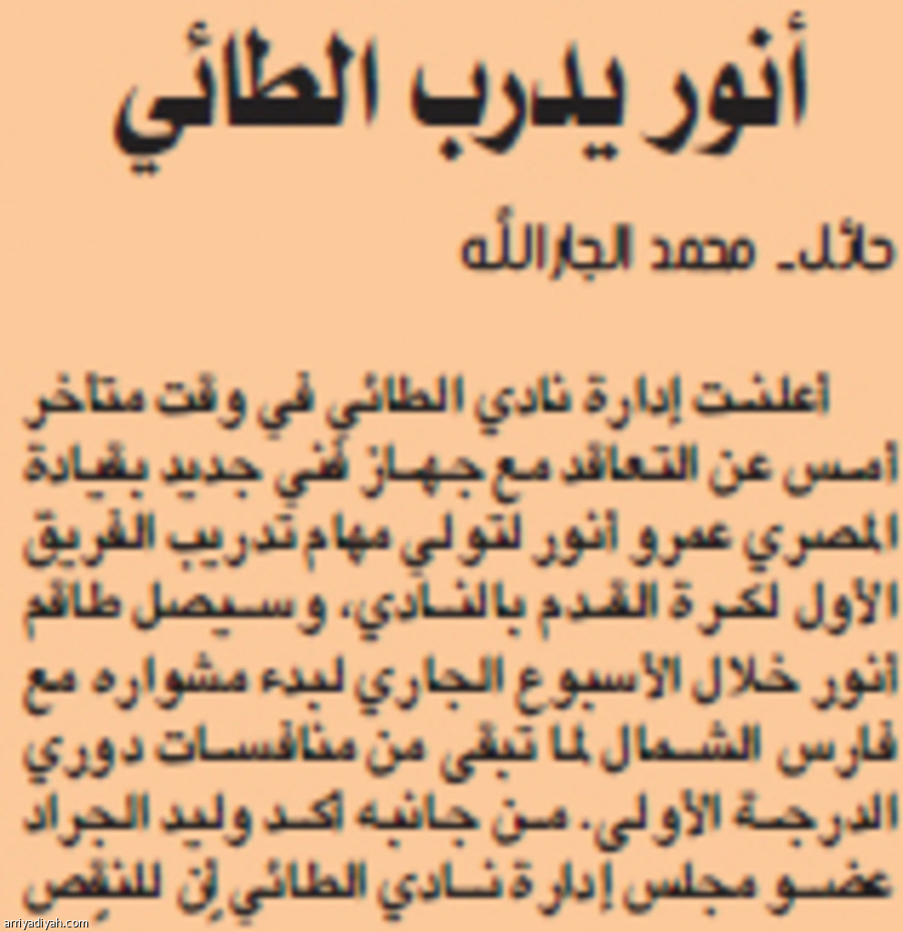 أعلنت إدارة نادي الطائي في وقت متأخر أمس عن التعاقد مع جهاز فني جديد بقيادة المصري عمرو أنور لتولي مهام تدريب الفريق الأول لكرة القدم بالنادي، وسيصل طاقم أنور خلال الأسبوع الجاري لبدء مشواره مع فارس الشمال لما تبقى من منافسات دوري الدرجة الأولى. من جانبه أكد وليد الجراد عضو مجلس إدارة نادي الطائي أن للنقص العناصري والعامل اللياقي أثراً كبيراً في تراجع نتائج الفريق، مشيراً إلى أن ذلك لازم الفريق منذ بداية الموسم، مستدلاً بعدد المباريات التي يتقدم فيها الطائي ويخرج منها بالتعادل أو الخسارة بسبب ضعف المخزون اللياقي لدى اللاعبين.