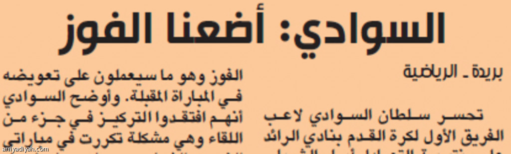 تحسر سلطان السوادي لاعب الفريق الأول لكرة القدم بنادي الرائد على نتيجة التعادل أمام الشباب بهدفين لكل منهما، معتبراً أنهم أضاعوا الفوز وهو ما سيعملون على تعويضه في المباراة المقبلة. وأوضح السوادي أنهم افتقدوا التركيز في جزء من اللقاء وهي مشكلة تكررت في مباراتي النصر والشباب سيعملون على إيجاد حل لها مع المدرب.