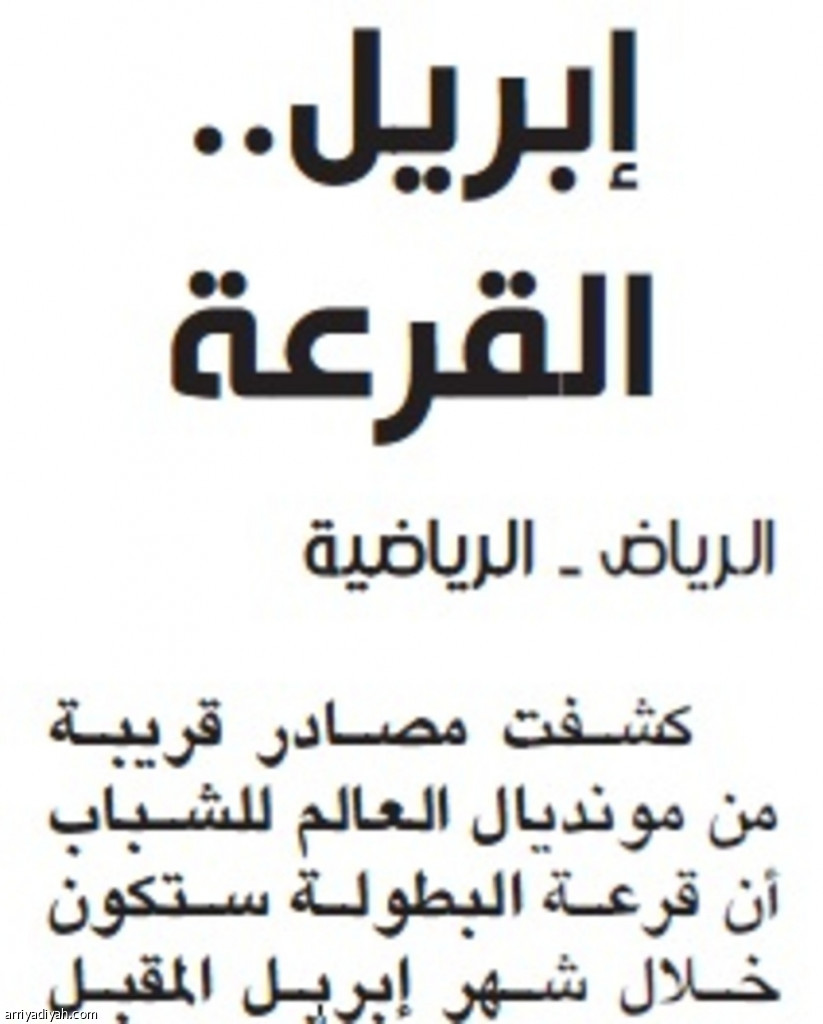 كشفت مصادر قريبة من مونديال العالم للشباب أن قرعة البطولة ستكون خلال شهر إبريل المقبل بعد وصول كافة المنتخبات المتأهلة إلى المونديال، حيث وصلت حتى الآن منتخبات آسيا وأوروبا إلى جانب البلد المضيف وحامل اللقب إسبانيا.