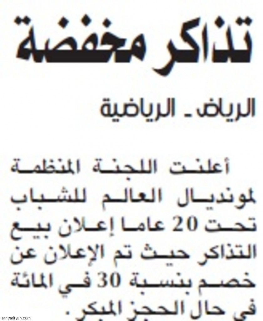 أعلنت اللجنة المنظمة لمونديال العالم للشباب تحت 20 عاما إعلان بيع التذاكر حيث تم الإعلان عن خصم بنسبة 30 في المائة في حال الحجز المبكر .وتتفاوت أسعار التذاكر بحسب الملعب، حيث تتراوح بين 50 إلى 100 ريال بحسب أعمار المشجعين.
