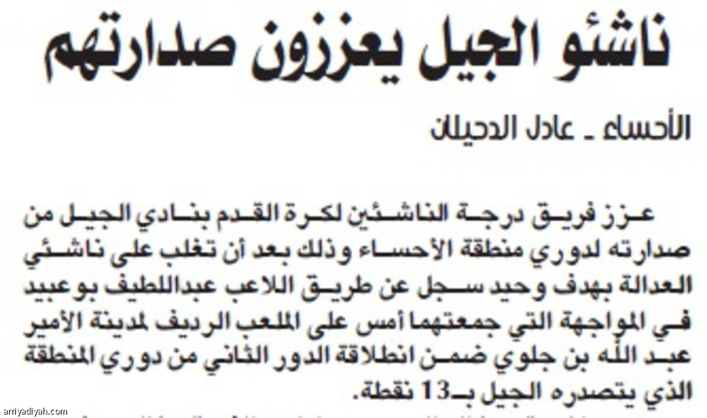 عزز فريق درجة الناشئين لكرة القدم بنادي الجيل من صدارته لدوري منطقة الأحساء وذلك بعد أن تغلب على ناشئي العدالة بهدف وحيد سجل عن طريق اللاعب عبداللطيف بوعبيد في المواجهة التي جمعتهما أمس على الملعب الرديف لمدينة الأمير عبد الله بن جلوي ضمن انطلاقة الدور الثاني من دوري المنطقة الذي يتصدره الجيل بـ13 نقطة.