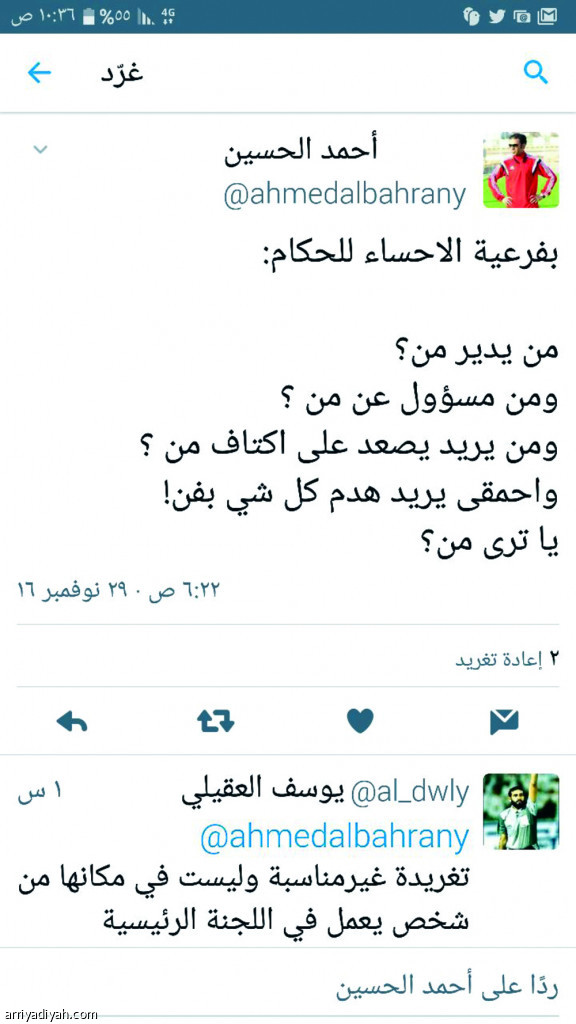 قدم ناصر مظفر رئيس لجنة الحكام الفرعية بالأحساء شكوى رسمية للجنة الحكام الرئيسية بالاتحاد السعودي لكرة القدم ضد أحمد البحراني المنسق الإعلامي للجنة الرئيسية، بسبب تغريداته التي أطلقها عبر حسابه في موقع التواصل الاجتماعي "تويتر" وجاء نصها: "بفرعية الأحساء للحكام: من يدير من؟ ومن مسؤول عن من؟ ومن يريد يصعد على أكتاف من؟ وأحمق يريد هدم كل شيء بفن ! يا ترى من؟".