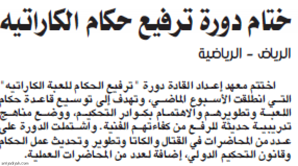 اختتم معهد إعداد القادة دورة "ترفيع الحكام للعبة الكاراتيه" التي انطلقت الأسبوع الماضي، وتهدف إلى توسيع قاعدة حكام اللعبة وتطويرهم والاهتمام بكوادر التحكيم، ووضع مناهج تدريبية حديثة للرفع من كفاءتهم الفنية. واشتملت الدورة على عدد من المحاضرات في القتال والكاتا وتطوير وتحديث عمل الحكام وقانون التحكيم الدولي، إضافة لعدد من المحاضرات العملية.