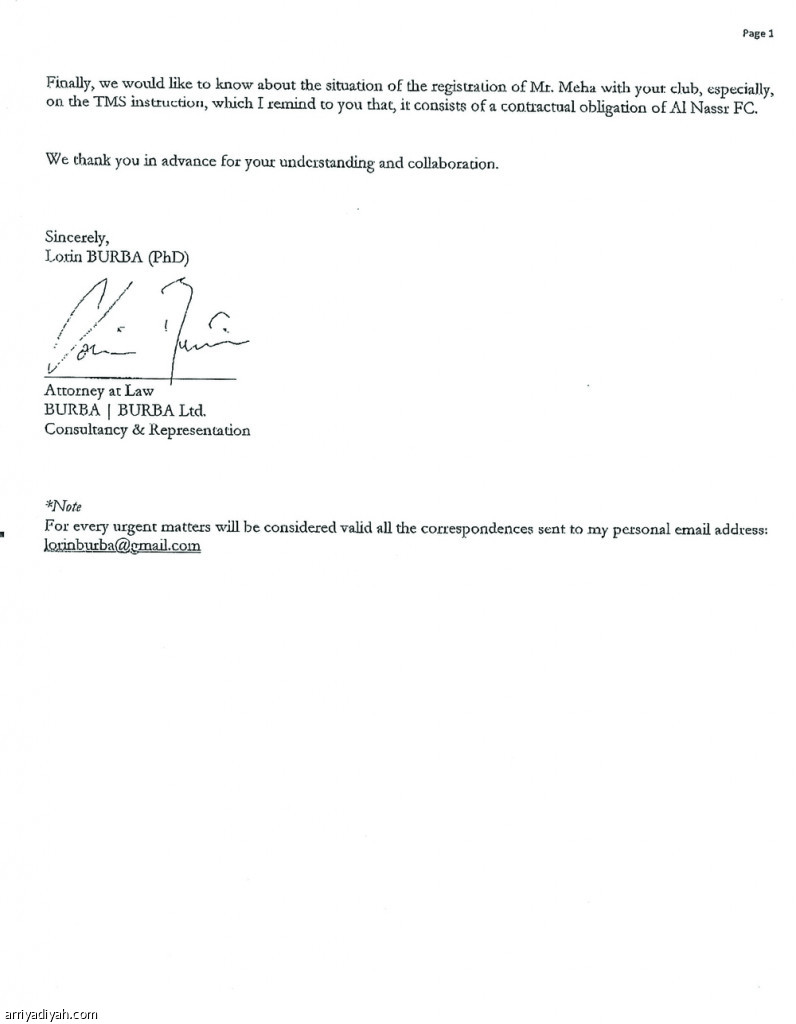 وجاء في خطاب المحامي: "بعد إبرام الاتفاقية الخاصة بدفع الاستحقاقات المالية بتاريخ 4 يوليو 2016 والتي أرسلت لنادي النصر بالإيميل ولعناية الدكتور تركي العولا والذي أجرينا معه مراسلات من البداية تتعلق بالتعارض حول الانتقال.. عليه نقدم لكم مرة أخرى هذه الوثيقة الرسمية على رقم الفاكس المذكور أعلاه ".