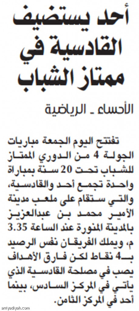 تفتتح اليوم الجمعة مباريات الجولة 4 من الدوري الممتاز للشباب تحت 20 سنة بمباراة واحدة تجمع أحد والقادسية، والتي ستقام على ملعب مدينة الأمير محمد بن عبدالعزيز بالمدينة المنورة عند الساعة 3.35 م، ويملك الفريقان نفس الرصيد بـ4 نقاط لكن فارق الأهداف يصب في مصلحة القادسية الذي يأتي في المركز السادس، بينما أحد في المركز الثامن.