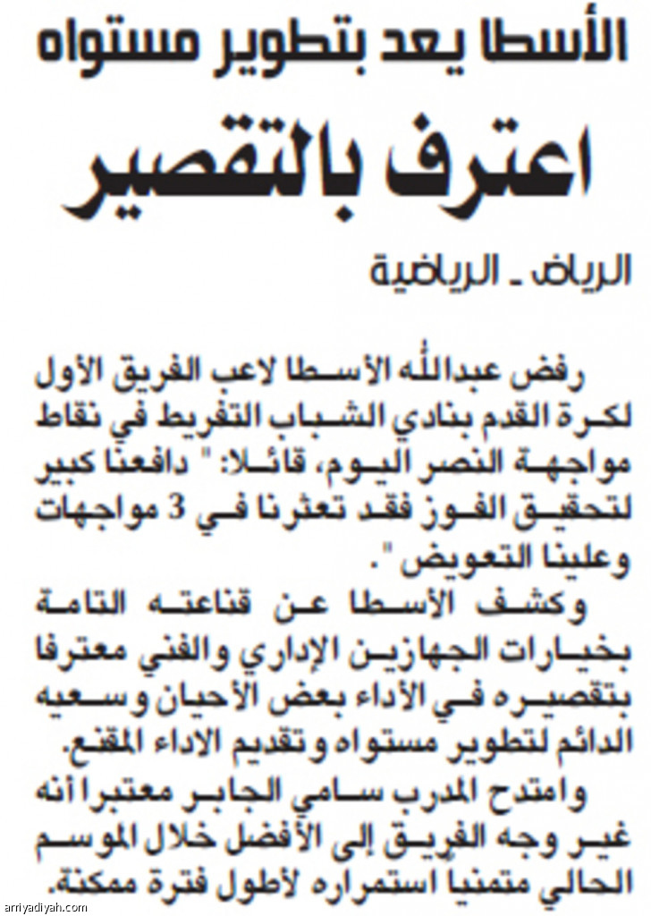 رفض عبدالله الأسطا لاعب الفريق الأول لكرة القدم بنادي الشباب التفريط في نقاط مواجهة النصر اليوم، قائلا:" دافعنا كبير لتحقيق الفوز فقد تعثرنا في 3 مواجهات وعلينا التعويض".