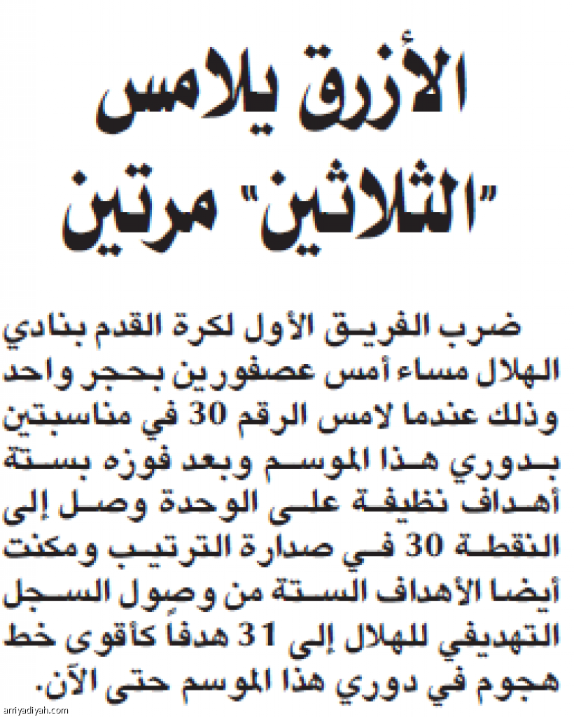 ضرب الفريق الأول لكرة القدم بنادي الهلال مساء أمس عصفورين بحجر واحد وذلك عندما لامس الرقم ٣٠ في مناسبتين بدوري هذا الموسم وبعد فوزه بستة أهداف نظيفة على الوحدة وصل إلى النقطة ٣٠ في صدارة الترتيب ومكنت أيضا الأهداف الستة من وصول السجل التهديفي للهلال إلى ٣١ هدفاً كأقوى خط هجوم في دوري هذا الموسم حتى الآن.