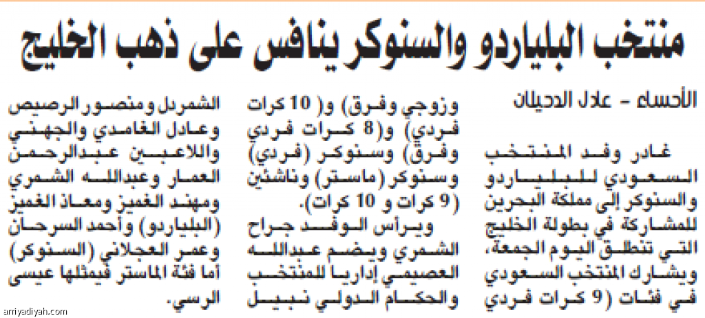 غادر وفـد المـنـتـخب الـسعـودي لـلـبـلـيـاردو والسنوكر إلى مملكة البحرين للمشاركة في بطولة الخليج التي تنطلق اليوم الجمعة، ويشارك المنتخب السعودي في فئات (9 كرات فردي وزوجي وفرق) و( 10 كرات فردي) و(8 كـرات فردي وفرق) وسنوكـر (فردي) وسنوكر (ماستر) وناشئين (9 كرات و 10 كرات).
