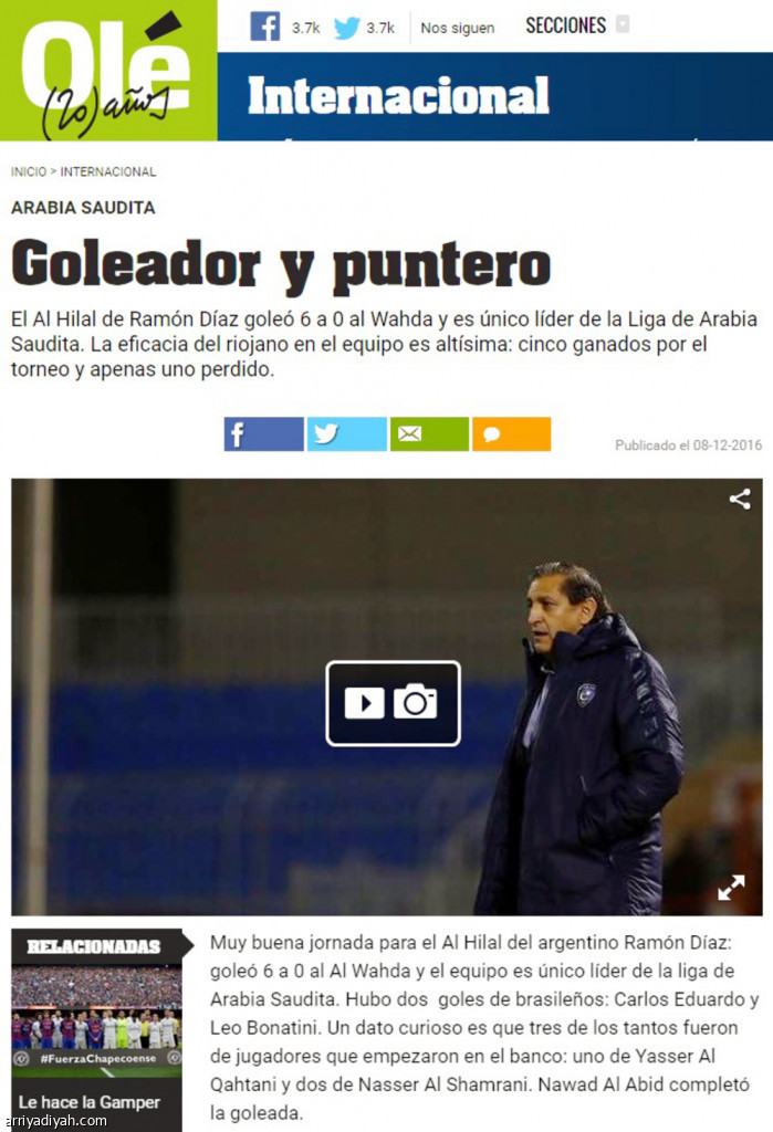 توقف موقع صحيفة (أوليه)، أشهر الصحف الرياضية في الأرجنتين، عند الفوز العريض الذي حققه الهلال على الوحدة بسداسية في الجولة الـ 12 من دوري جميل.
