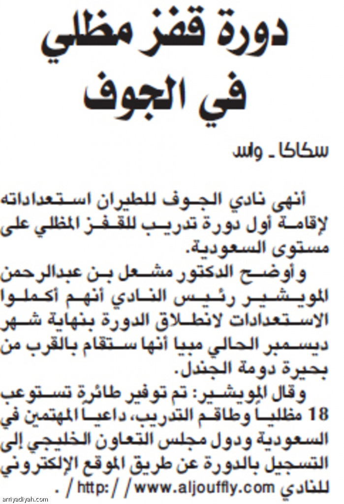 وقال المويشير: تم توفير طائرة تستوعب 18 مظلياً وطاقم التدريب، داعياً المهتمين في السعودية ودول مجلس التعاون الخليجي إلى التسجيل بالدورة عن طريق الموقع الإلكتروني للنادي http://www.aljouffly.com/ .