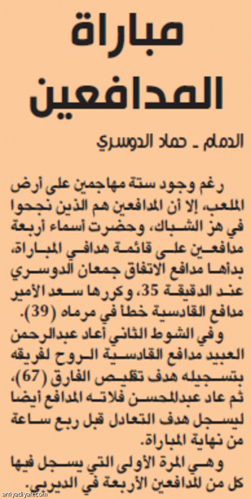 رغم وجود ستة مهاجمين على أرض الملعب، إلا أن المدافعين هم الذين نجحوا في هز الشباك، وحضرت أسماء أربعة مدافعين على قائمة هدافي المباراة، بدأها مدافع الاتفاق جمعان الدوسري عند الدقيقة 35، وكررها سعد الأمير مدافع القادسية خطأ في مرماه (39).