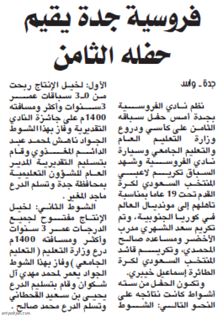 نظم نادي الفروســية بجدة أمس حفل سباقه الثامن على كأسي ودروع وزارة التعليم العام والتعليم الجامعي وسيارة نادي الفروســية وشهد السباق تكريــم لاعبـــي المنتخب السعودي لكرة القدم تحت 19 عاما بمناسبة تأهلهم إلى مونديال العالم في كوريا الجنوبية، وتم تكريم سعد الشهري مدرب الأخضر ومساعده صالح المحمدي، وتكريـــم قائد المنتخب السعودي لكرة الطائرة إسماعيل خيبري.