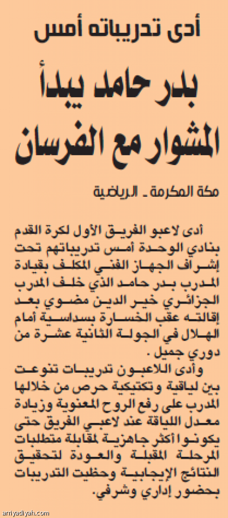 أدى لاعبو الفريق الأول لكرة القدم بنادي الوحدة أمس تدريباتهم تحت إشراف الجهاز الفني المكلف بقيادة المدرب بدر حامد الذي خلف المدرب الجزائري خير الدين مضوي بعد إقالته عقب الخسارة بسداسية أمام الهلال في الجولة الثانية عشرة من دوري جميل .