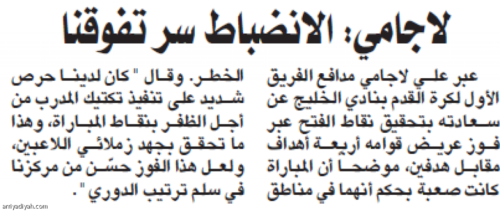 عبر علي لاجامي مدافع الفريق الأول لكرة القدم بنادي الخليج عن سعادته بتحقيق نقاط الفتح عبر فوز عريض قوامه أربعة أهداف مقابل هدفين، موضحاً أن المباراة كانت صعبة بحكم أنهما في مناطق الخطر. وقال "كان لدينا حرص شديد على تنفيذ تكتيك المدرب من أجل الظفر بنقاط المباراة، وهذا ما تحقق بجهد زملائي اللاعبين، ولعل هذا الفوز حسّن من مركزنا في سلم ترتيب الدوري".