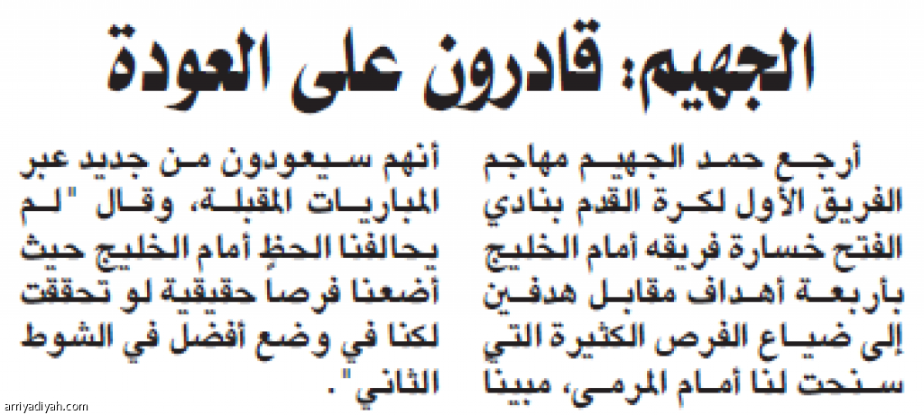 أرجع حمد الجهيم مهاجم الفريق الأول لكرة القدم بنادي الفتح خسارة فريقه أمام الخليج بأربعة أهداف مقابل هدفين إلى ضياع الفرص الكثيرة التي سنحت لنا أمام المرمى، مبيناً أنهم سيعودون من جديد عبر المباريات المقبلة، وقال "لم يحالفنا الحظ أمام الخليج حيث أضعنا فرصاً حقيقية لو تحققت لكنا في وضع أفضل في الشوط الثاني".