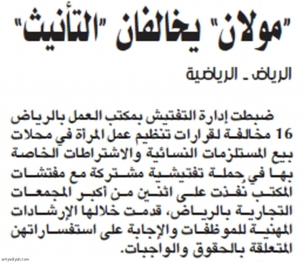 ضبطت إدارة التفتيش بمكتب العمل بالرياض 16 مخالفة لقرارات تنظيم عمل المرأة في محلات بيع المستلزمات النسائية والاشتراطات الخاصة بها في حملة تفتيشية مشتركة مع مفتشات المكتب نُفذت على اثنين من أكبر المجمعات التجارية بالرياض، قدمت خلالها الإرشادات المهنية للموظفات والإجابة على استفساراتهن المتعلقة بالحقوق والواجبات. ‏‎