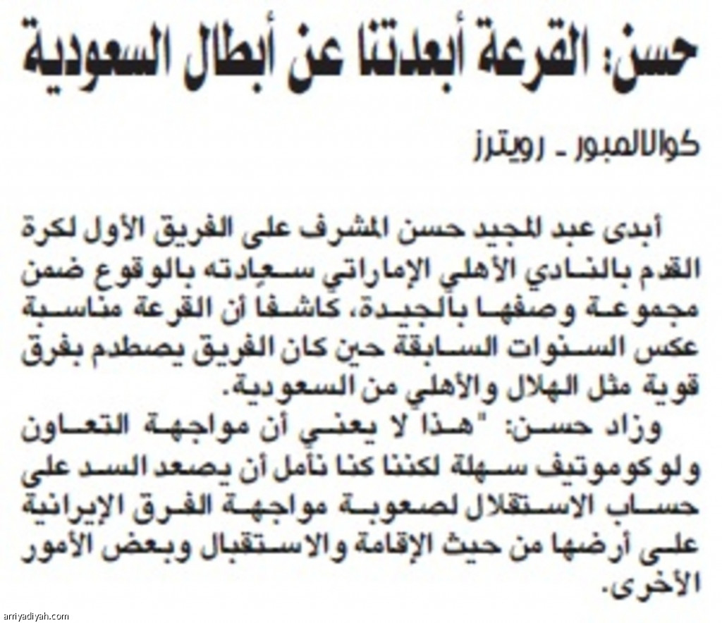 أبدى عبد المجيد حسن المشرف على الفريق الأول لكرة القدم بالنادي الأهلي الإماراتي سعادته بالوقوع ضمن مجموعة وصفها بالجيدة، كاشفاً أن القرعة مناسبة عكس السنوات السابقة حين كان الفريق يصطدم بفرق قوية مثل الهلال والأهلي من السعودية.