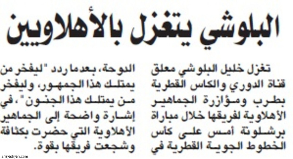 تغزل خليل البلوشي معلق قناة الدوري والكاس القطرية بطرب ومؤازرة الجماهير الأهلاوية لفريقها خلال مباراة برشلونة أمس على كأس الخطوط الجوية القطرية في الدوحة، بعدما ردد "ليفخر من يمتلك هذا الجمهور، وليفخر من يمتلك هذا الجنون"، في إشارة واضحة إلى الجماهير الأهلاوية التي حضرت بكثافة وشجعت فريقها بقوة.