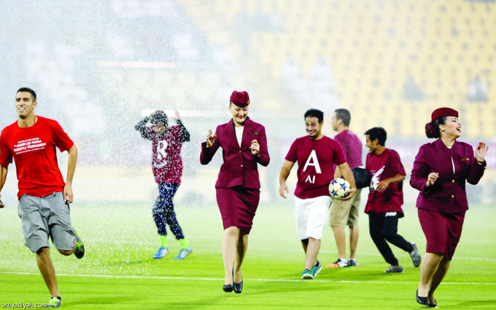 أثناء انتظار مضيفات الخطوط الجوية القطرية بداية الاحتفالات التي سبقت مباراة الأهلي والبرشا تلقين مفأجاة غير متوقعة، تمثلت في تشغيل جهاز رش المياه داخل الملعب والذي أجبرهن على الركض إلى مكان آمن الأمر الذي جعل الجماهير تسجل الموقف بالتصوير عبر أجهزتهم المحمولة.
