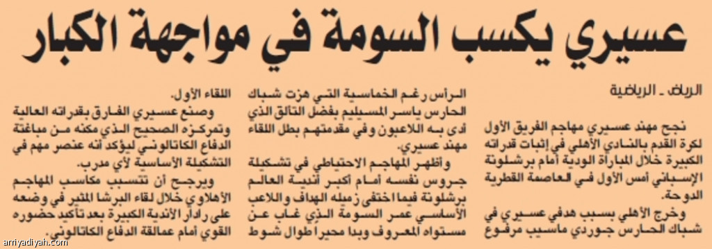 سجل الفريق الأهلاوي رقماً لافتاً خلال مواجهته الودية مع برشلونة أمس الأول ونجح في الوصول إلى الشباك الكاتالونية 3 مرات في وقت قصير، حيث سجل عموري الهدف الأول من ركلة جزاء في الدقيقة 51 قبل أن يسجل مهند عسيري هدفين في الدقيقتين 59 و65، علماً بأن الخط الخلفي لبرشلونة ضم أسماء لامعة على رأسهم الأرجنتيني خافيير ماسكيرانو والفرنسيين صامويل أومتيتي ولوكاس دينيي.