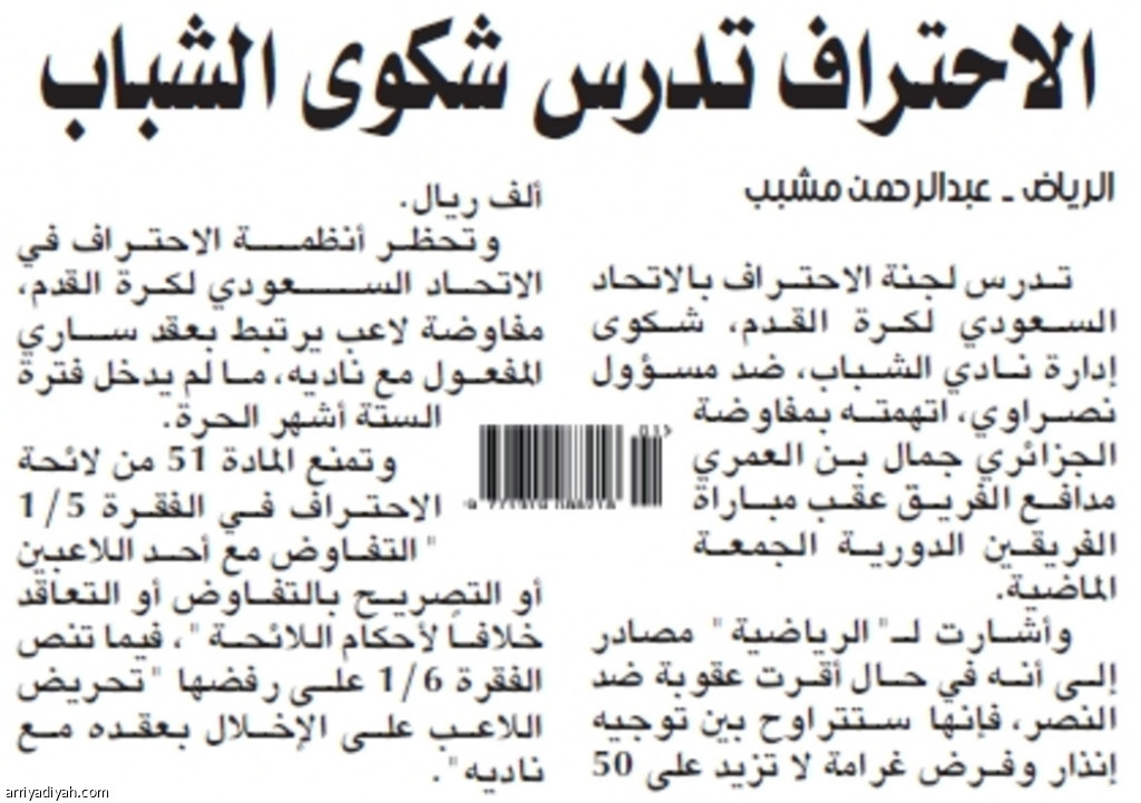 تدرس لجنة الاحتراف بالاتحاد السعودي لكرة القدم، شكوى إدارة نادي الشباب، ضد مسؤول نصراوي، اتهمته بمفاوضة الجزائري جمال بن العمري مدافع الفريق عقب مباراة الفريقين الدورية الجمعة الماضية.
