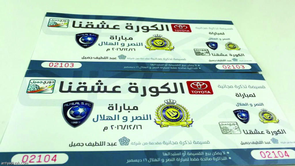 وزعـــت شـركة عبداللطيــف جميل ـ الراعي الرسمي لدوري المحترفين الســـــعودي ـ عدداً مـن التذاكر المجانيه التي حملت شعار الشركة وشـعار "الكورة عشقنا" على عدد كبير من عملائها، وذلك لحضور قمـة الكــرة الســعودية بين فريقـــي النصر والهلال مســاء اليوم الجمعـة على ملعــب الملك فهـــد الدولي بالرياض، ضمن الجولة الـ13 (الأخيرة من مباريات الدور الأول) لدوري جميل للمحترفين.