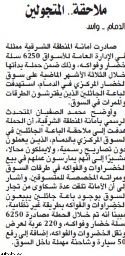 وأوضح محمد الصفيان المتحدث الرسمي بأمانة المنطقة الشرقية, أن الحملة هدفت إلى ملاحقة الباعة الجائلين في السوق المركزي بالدمام، الذين يعملون دون تصاريح رسمية، ولايملكون محالا، مشيرًا إلى أنهم يمارسون عملهم في بيع الخضراوات والفواكه في طرقات السوق وممراته المخصصة للمتسوقين. وأشار إلى أن الأمانة تلقت عدة شكاوى من تجار السوق بوجود باعة جائلين يبيعون الخضراوات والفواكه بطريقة غير نظامية، مبينًا أنه تم خلال الحملة مصادرة 6250 سلة خضار وفواكه، و220 عربة لعرض ونقل الخضروات والفواكه، إضافة إلى رفع 50 سيارة وشاحنة مهملة داخل السوق.