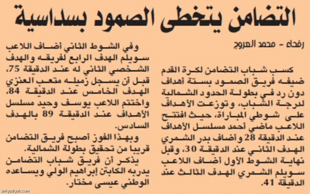كسب شباب التضامن لكرة القدم ضيفه فريق الصمود بستة أهداف دون رد في بطولة الحدود الشمالية لدرجة الشباب، وتوزعت الأهداف على شوطي المباراة، حيث افتتح اللاعب ماضي أحمد مسلسل الأهداف عند الدقيقة 28 وأضاف بدر الشمري الهدف الثاني عند الدقيقة 30، وقبل نهاية الشوط الأول أضاف اللاعب سويلم الشمري الهدف الثالث عند الدقيقة 41.