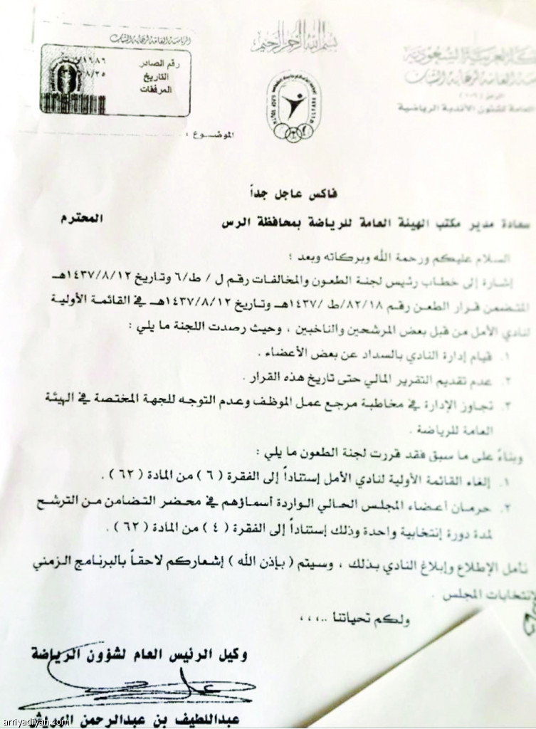 سارع مكتب الهيئة العامة للرياضة في محافظة الرس بإرسال خطاب إلى الدكتور عبداللطيف الهريش وكيل الرئيس العام لشؤون الرياضة، تضمن محضر إقرار الأعضاء ـ حصلت "الرياضية" على صورة منه ـ ومختوماً بتوقيع عبدالرحمن الزيدي مدير مكتب هيئة الرياضة في محافظة الرس، إلى جانب محمد الصائغ مسؤول شؤون الأندية في المكتب، وينتظر أن تصدر هيئة الرياضة قرارها النهائي في القضية خلال الأسابيع المقبلة.