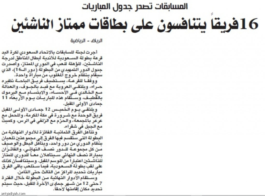 16فريقاً يتنافسون على بطاقات ممتاز الناشئين