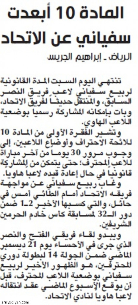 تنتهي اليوم السبت المدة القانونية لربيع سفياني لاعب فريق النصر السابق، والمنتقل حديثاً لفريق الاتحاد، وبات بإمكانه المشاركة رسمياً بوضعية اللاعب الهاوي.