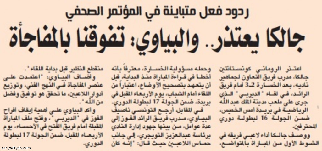 اعتذر الروماني كونستانتين جالكا، مدرب فريق التعاون لجماهير ناديه، بعد الخسارة 2ـ3 أمام فريق الرائد، في لقاء "الديربي" الذي جرى على ملعب مدينة الملك عبد الله الرياضية في بريدة أمس الخميس، ضمن الجولة 16 لبطولة دوري المحترفين.