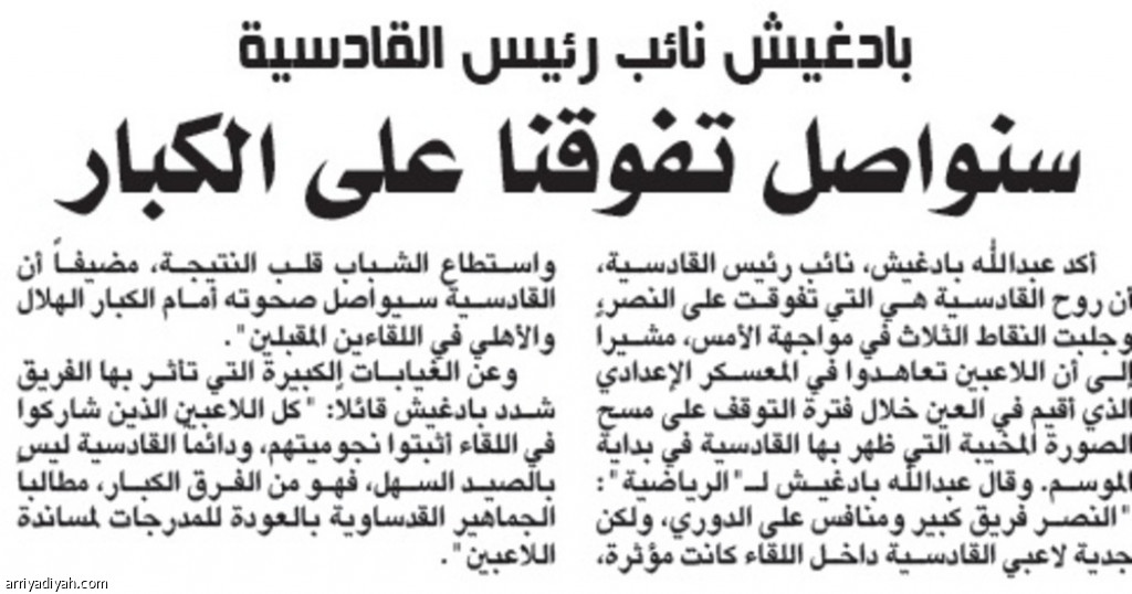 وعن الغيابات الكبيرة التي تأثر بها الفريق شدد بادغيش قائلاً: "كل اللاعبين الذين شاركوا في اللقاء أثبتوا نجوميتهم، ودائماً القادسية ليس بالصيد السهل، فهو من الفرق الكبار، مطالباً الجماهير القدساوية بالعودة للمدرجات لمساندة اللاعبين".