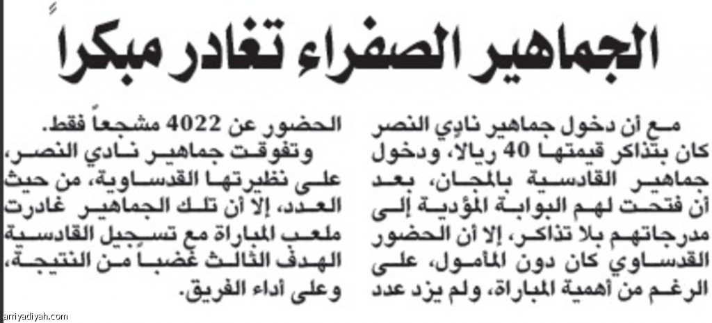 مع أن دخول جماهير نادي النصر كان بتذاكر قيمتها 40 ريالاً، ودخول جماهير القادسية بالمجان، بعد أن فتحت لهم البوابة المؤدية إلى مدرجاتهم بلا تذاكر، إلا أن الحضور القدساوي كان دون المأمول، على الرغم من أهمية المباراة، ولم يزد عدد الحضور عن 4022 مشجعاً فقط.