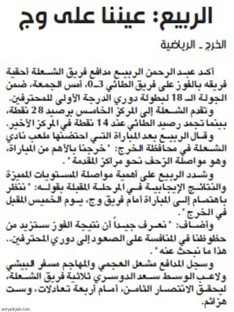 وقال الربيع بعد المباراة التي احتضنها ملعب نادي الشعلة في محافظة الخرج: "خرجنا بالأهم من المباراة، وهو مواصلة الزحف نحو مراكز المقدمة".